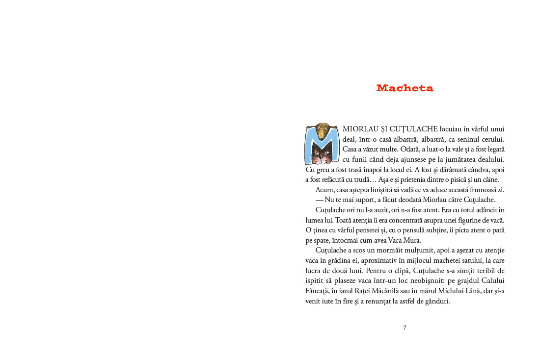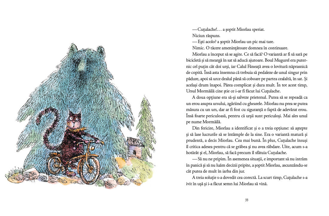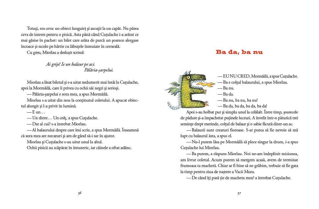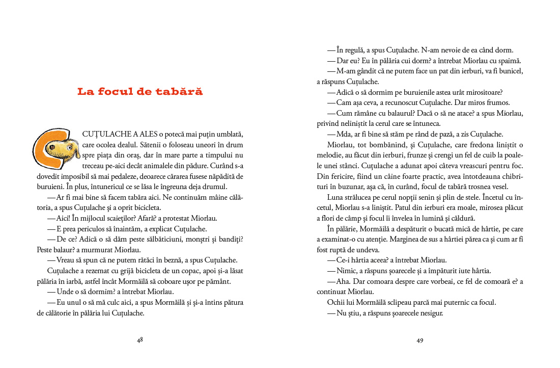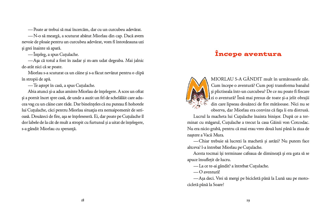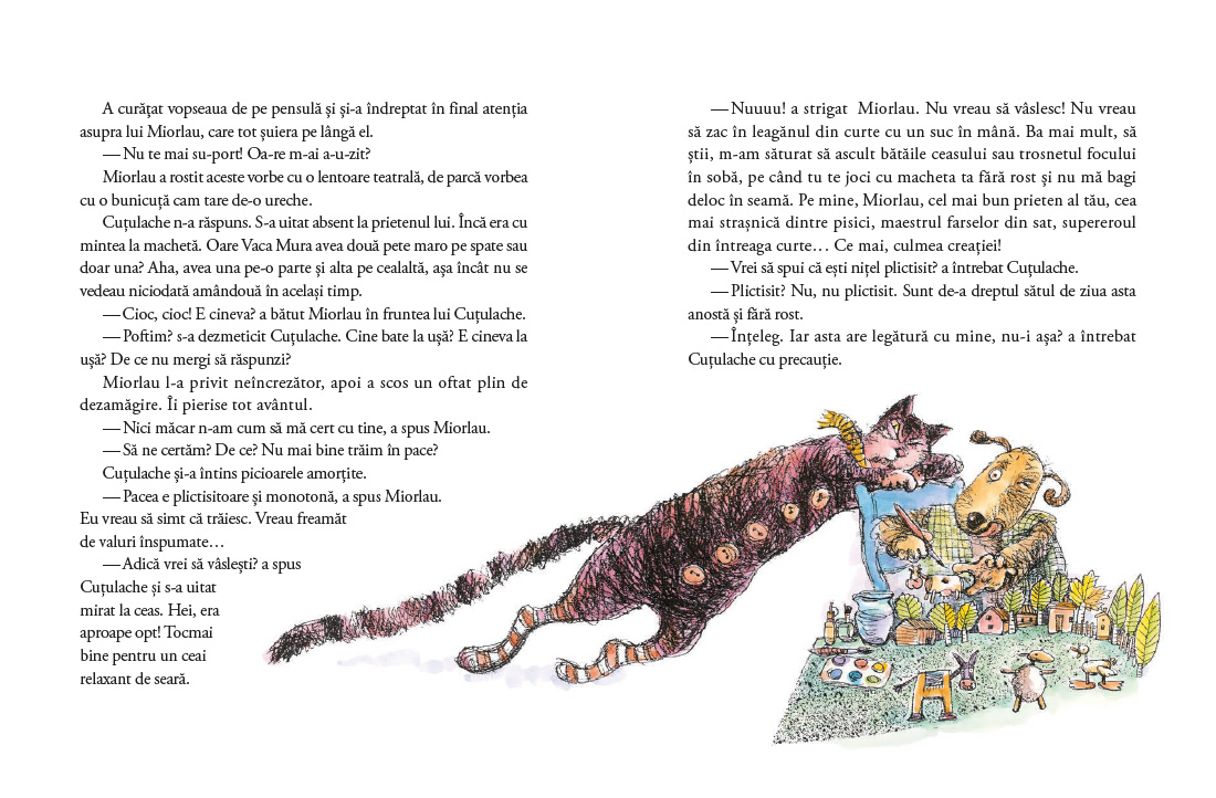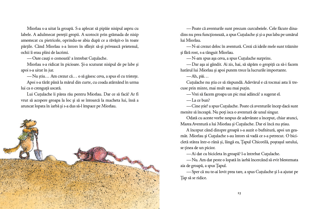 „Marea aventură” este al doilea roman din seria „Miorlau și Cuțulache“, despre o pisică și un câine care trăiesc într-o casă albastră „ca seninul cerului” de pe vârful unui deal. Capitolele scurte, însoțite de ilustrații, cu text accesibil și mult umor, fac acest roman foarte potrivit pentru copiii care citesc singuri și doresc să facă trecerea spre lecturile de mai mare întindere.